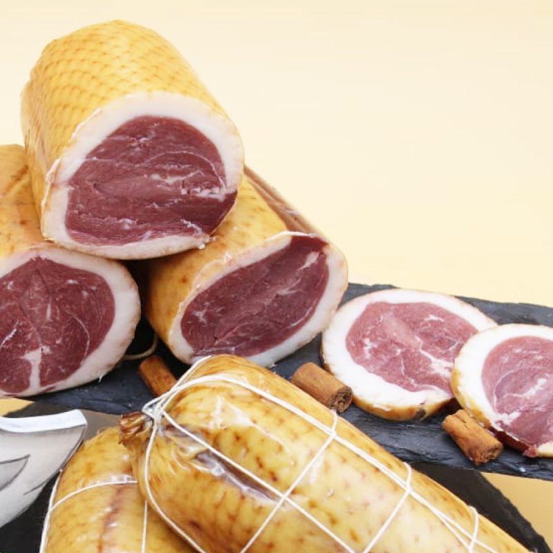 Tagliato finemente è da degustare come antipasto, consigliato con mele caramellate e gocce di aceto balsamico.