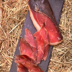 Marinato con aromi naturali per circa 20 giorni e successivamente lavato con del vino bianco secco e messo a stagionare lentamente per altri 60.