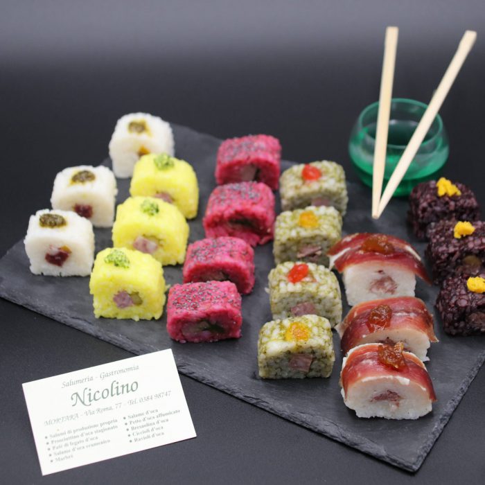 Vieni a trovarci alla Salumeria Nicolino di Mortara e lasciati conquistare dal Sushi d’Oca: la tradizione della Lomellina in un boccone di innovazione.