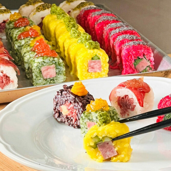Uramaki Rosso: Una combinazione di barbabietola, prosciutto d’oca cotto e spinacino fresco, perfetta per chi ama i sapori delicati e un’estetica vivace e moderna.